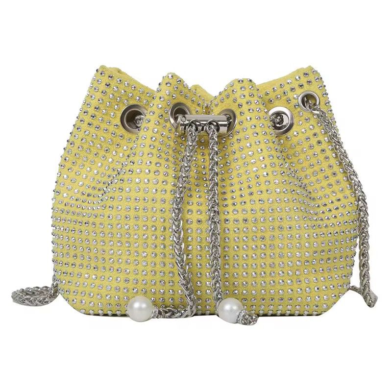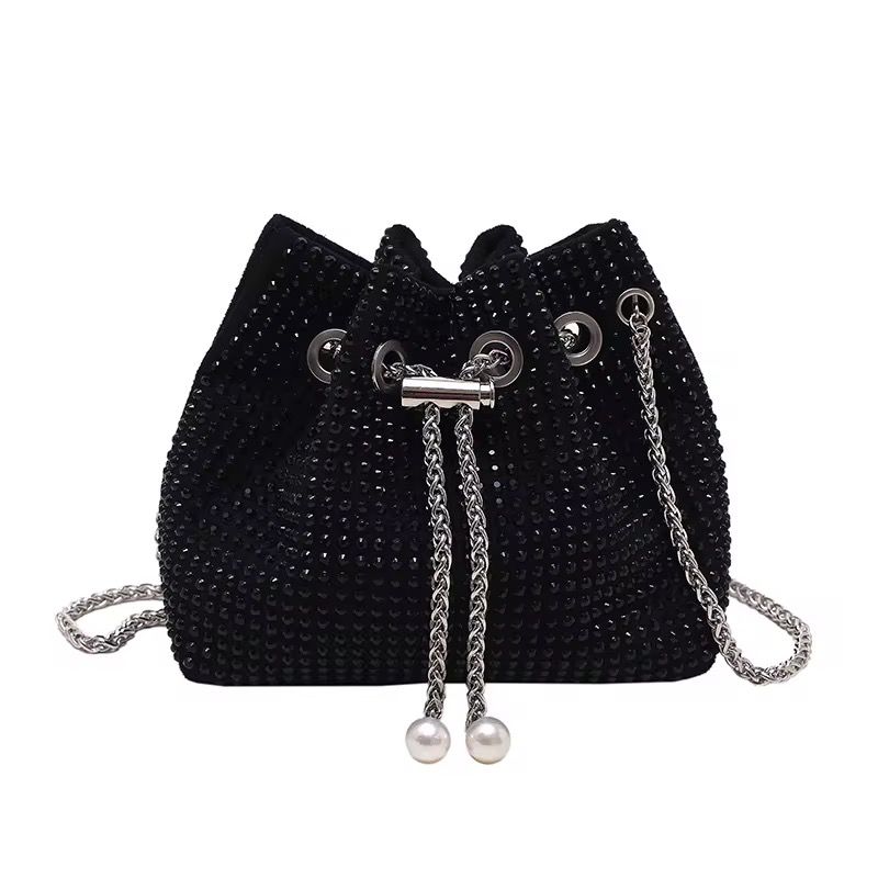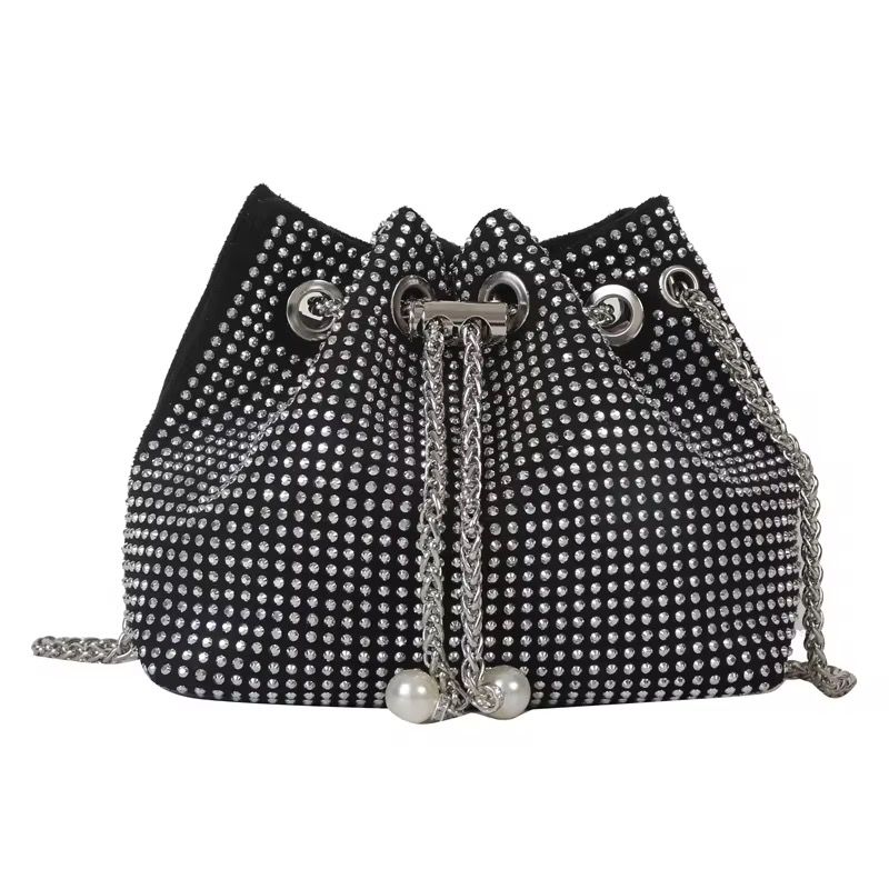 This eye-catching bucket bag is covered in shimmering rhinestones for maximum glamour. It features a chic drawstring closure secured by chain tassels
